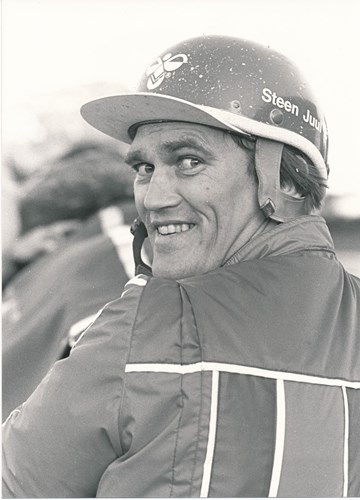 Her ses Steen Juul i rollen som staldmand for Torino efter sejren i Jydsk 2-årings Grand Prix 1974 på Jydsk Væddeløbsbane med svigerfar Børge Simonsen i sulkyen.