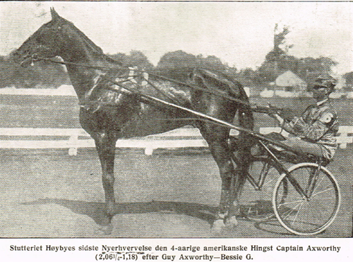 Billedet af Captain Axworthy er fra dens karriere i USA. Den blev indført til Danmark i maj 1927 som fireårs, og herhjemme nåede den at blive avlschampion seks gange.
